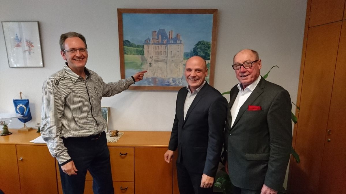 Zuletzt wandte man sich einem uneingeschränkt erfreulichen Thema zu: den Städtepartnerschaften: Einerseits mit Ormesson-sur-Marne, zu deren Gründungsmitgliedern Roland Schnepf gehört, ist sie doch jetzt 40 Jahre alt. Andererseits mit Dourtenga in Westafrika, das Göck im Januar besuchen wird, unterstützt auch von Daniel Born als Mitglied des Förderkreises Dourtenga. Stolz zeigte Göck seinem Gast dann auch ein Gemälde des Schlosses in Ormesson-sur-Marne, das in seinem Amtszimmer hängt.