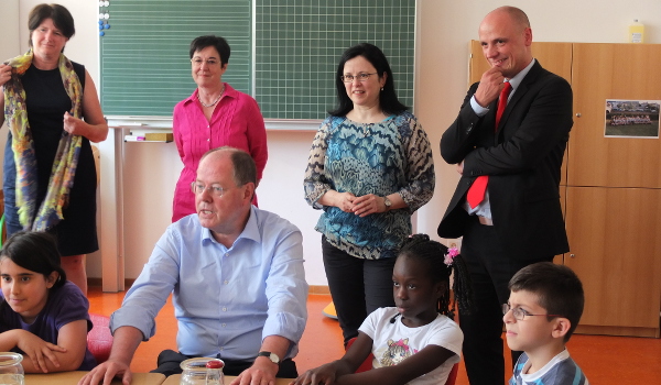 Peer Steinbrück war mit dem Besuch in Bruchsaler einer Einladung des Vereins „Kulterbunt“ gefolgt. Kulturbunt zeichnet seit 2009 für ein erfolgreiches Sprachförderprojekt an der Stirumschule verantwortlich. Peer Steinbrück erläuterte anschließend in einer Pressekonferenz im Schulhof, welche Bedeutung Projekte wie das der Sprachförderung an der Stirumschule haben.