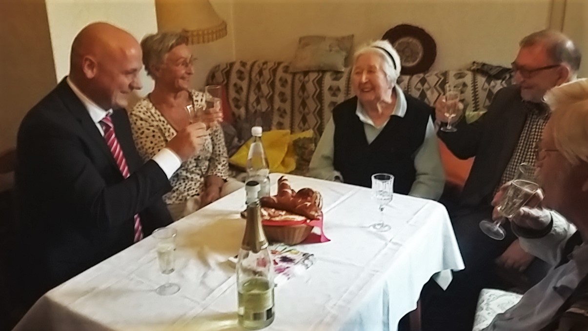 Die Seniorenbeauftragten der Altlußheimer Sozialdemokraten, Christa Rettig und Dr. Karl-Heinz Haar freuten sich über dieses Geständnis. „Die nächste Landtagswahl ist aber erst 2021, das ist noch eine Weile hin“, erinnerte Rettig und Haar fügte hinzu, „bis dahin kommen wir auch zu jedem Geburtstag gerne vorbei.“ Dass Elsa Fischer nicht nur bei der SPD und der AWO viele Freundschaften hat, sondern eine geschätzte Altlußheimerin ist, zeigten nicht nur die vielen Glückwunschkarten, sondern auch der Besuch von Pfarrer Matthias Zeiss, der auch auf das Geburtstagskind anstieß.
