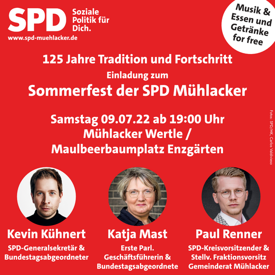 KEVIN KÜHNERT KOMMT: Am 9. Juli ab 19 Uhr feiern wir 125 Jahre SPD Mühlacker. Merk' Dir schon mal das Datum! Es gibt Musik und sogar Essen & Trinken for free. Das ganze wird an den Enzgärten in Mühlacker stattfinden.