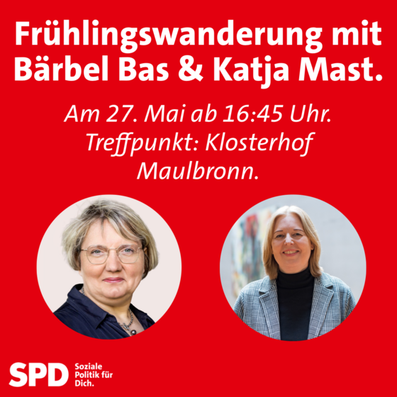 Die SPD-Bundestagsabgeordnete Katja Mast und die SPD in der Region laden am 27. Mai unter dem Motto "Frühlingswanderung mit Bärbel Bas und Katja Mast" zu einer öffentlichen Wanderung und Einkehr mit der Bundestagspräsidentin ein. Die Frühlingswanderung findet an Stelle des traditionellen Neujahrsempfangs statt, der aufgrund der Corona-Pandemie ausfallen musste. Mit Bundestagspräsidentin Bas kommt die nach dem Bundespräsidenten protokollarisch ranghöchste Vertreterin der Bundesrepublik in die Region.