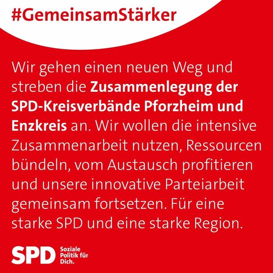 „Gemeinsam sind wir stärker“, so die stellvertretende Vorsitzende der SPD Pforzheim Johanna Kirsch und der Vorsitzende der Enzkreis-SPD Paul Renner. „Wir arbeiten schon viele Jahre sehr gut zusammen. Gerade der Landtagswahl- und Bundestagswahlkampf, sowie die gemeinsame SPD-Akademie haben uns das nochmal gezeigt. Das haben wir zusammen gestemmt. Auch der gemeinsame Neujahrsempfang, sowie viele gemeinsame Aktivitäten sind für uns seit vielen Jahren selbstverständlich. Wir handeln zusammen und dem soll jetzt auch die Struktur folgen.“