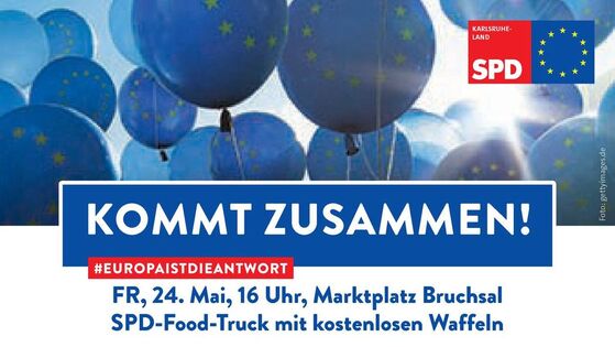 Zwei Tage vor der Gemeinderats-, Kreistags- und Europawahl lädt die SPD Karlsruhe-Land zur großen Abschlussveranstaltung mit dem SPD-Food-Truck am FR, 24. Mai, ab 16 Uhr nach Bruchsal ein. Hierzu sind alle Bürgerinnen und Bürger herzlich eingeladen. Gegen 17 Uhr soll gemeinsam die Europahymne gesungen werden.