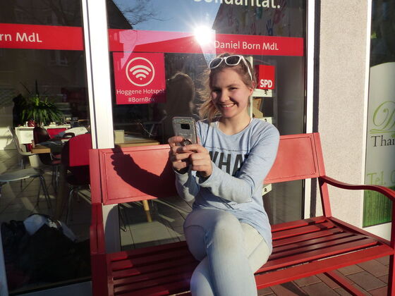 Hockenheim. SPD-Gemeinderatskandidatin Sabrina Brunner hat es als eine der ersten ausprobiert: „Der Hoggene-Hotspot auf der roten Bank läuft!“ stellt die 18-jährige Auszubildende fest. Als Hingucker ist die rote Bank vorm Wahlkreisbüro des SPD-Landtagsabgeordneten Daniel Born längst bekannt. Aber viele wissen auch, dass sich auf der roten Bank in der Schwetzinger Straße 10 gut Platz nehmen lässt – sei es um sich über aktuelle politische Themen zu informieren, auf den Bus zu warten oder einfach eine Pause einzulegen.