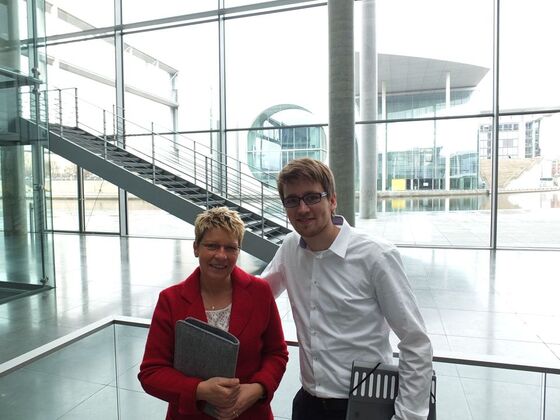 Gabriele Katzmarek begrüßt ihren ersten Praktikanten als Abgeordnete im Deutschen Bundestag. David Bohn, Student aus Heidelberg, wird Gabriele Katzmarek in den nächsten 5 Wochen begleiten und sie in in ihrem poltischen Alltag unterstützen. Neben der Mitarbeit im Büro stehen Plenardebatten, Fraktionssitzungen und Auschusssitzungen auf dem Tagesprogramm.